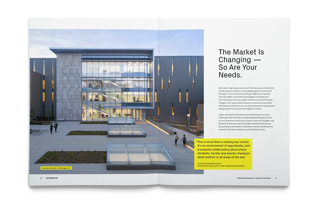 For Smithgroup, this rebrand was a bold step for the company. They wanted to project to their clients — and to the world — that they are an integrated, innovative, and future-forward firm. We harnessed the power of edgy typography and a bright, active yellow to tell that story.